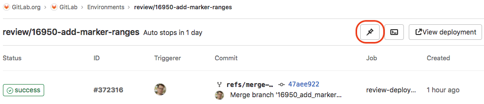 stages: - build - test - deploy ... deploy_review: stage: deploy environment: name: review/$CI_COMMIT_REF_SLUG url: https://$CI_ENVIRONMENT_SLUG.example.com on_stop: stop_review stop_review: stage: deploy environment: name: review/$CI_COMMIT_REF_SLUG action: stop when: manual