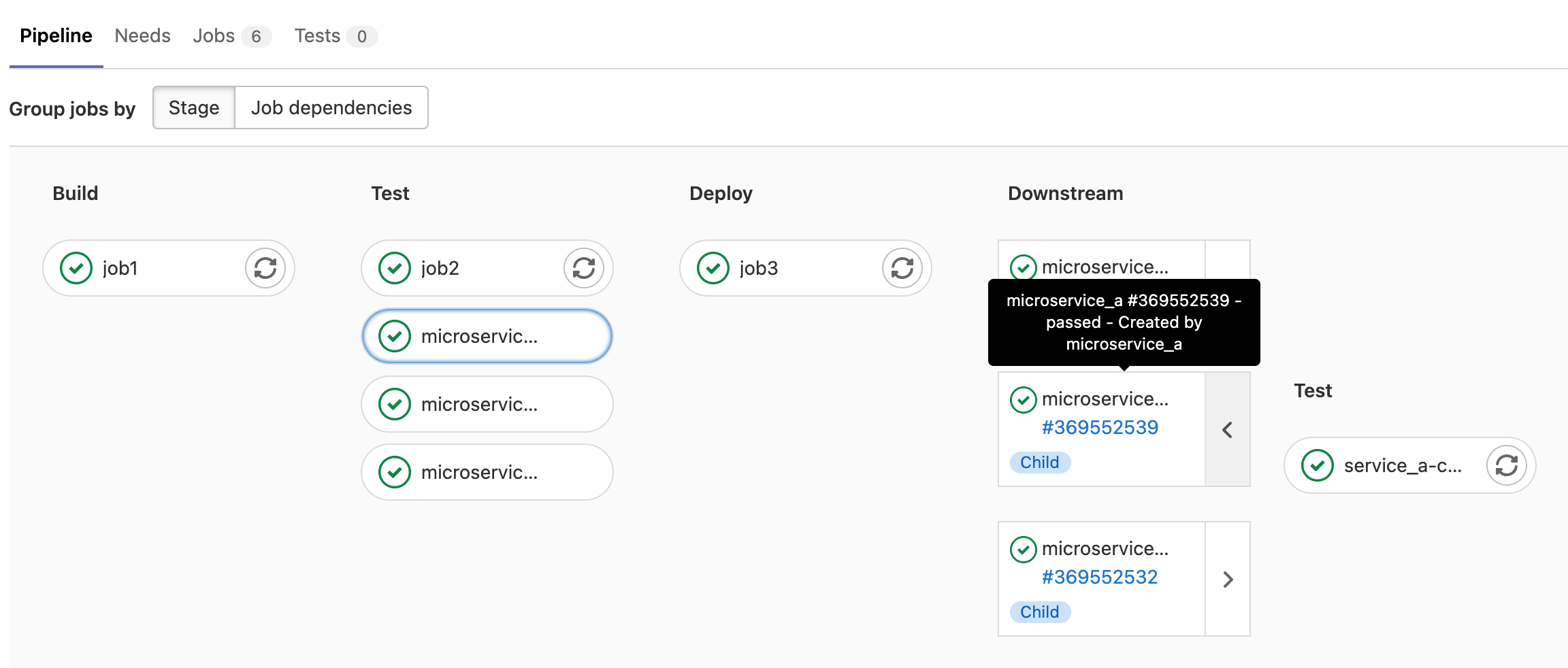 When you trigger a multi-project pipeline, the downstream pipeline displays to the right of the pipeline graph.
