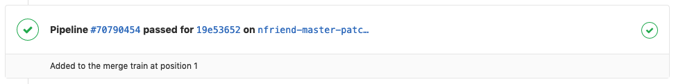 If the pipeline for the merge request at the front of the train completes successfully, the changes are merged into the target branch, and the other pipelines continue to run.