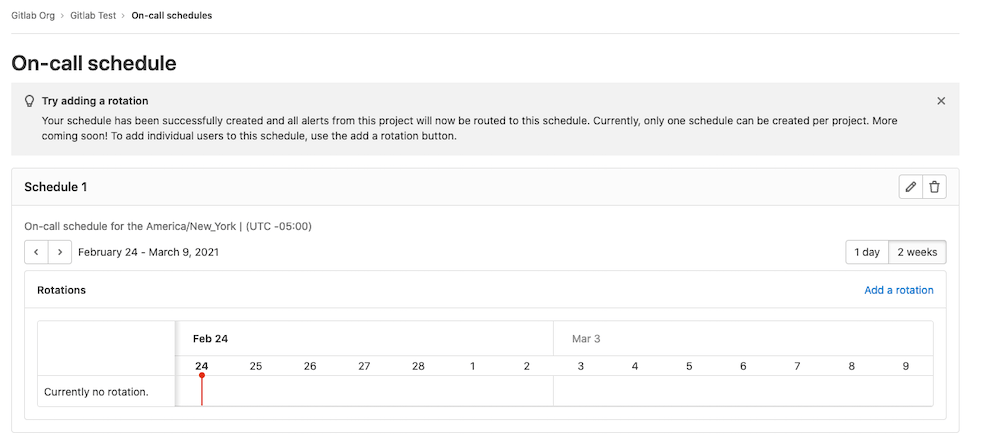 You now have an empty schedule with no rotations. This renders as an empty state, prompting you to create rotations for your schedule.
