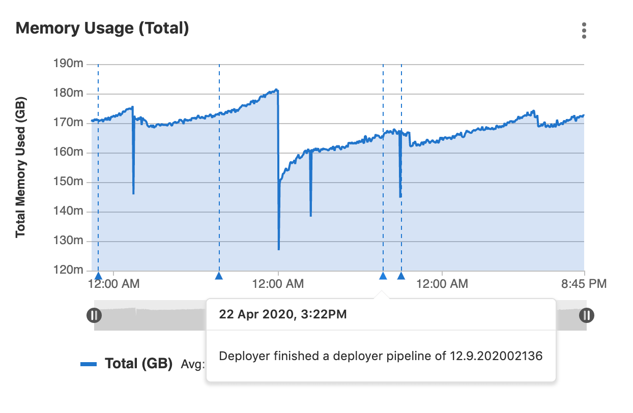 You can use Metrics Dashboard Annotations to mark any important events on every metrics dashboard by adding annotations to it. While viewing a dashboard, annotation entries assigned to the selected time range are automatically fetched and displayed on every chart within that dashboard. On mouse hover, each annotation presents additional details, including the exact time of an event and its description.