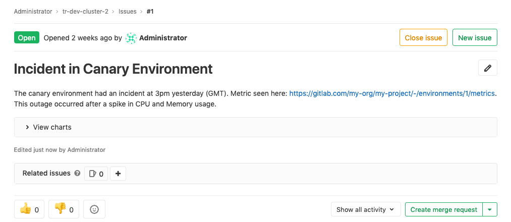 You can also embed either the overview dashboard metrics or individual metrics in issue templates. For charts to render side-by-side, separate links to the entire metrics dashboard or individual metrics by either a comma or a space.