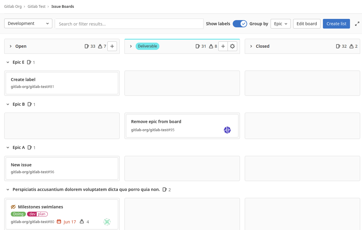 Multiple issue boards allow for more than one issue board for a given project in GitLab Free or group in GitLab Premium and higher tiers. This is great for large projects with more than one team or when a repository hosts the code of multiple products.