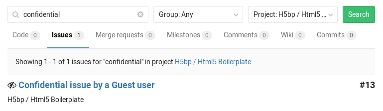 Confidential issues are also hidden in search results for unprivileged users. For example, here's what a user with the Maintainer role and the Guest role sees in the project's search results respectively.