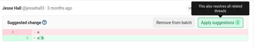 Having added all the suggestions to your liking, when ready, select Apply suggestions. You can optionally specify a custom commit message for batch suggestions (GitLab 14.4 and later) to describe your change. If you don't specify it, the default commit message is used.