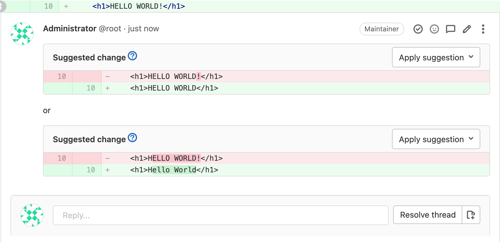 As a reviewer, you're able to suggest code changes with a Markdown syntax in merge request diff threads. Then, the merge request author (or other users with appropriate permission) can apply these suggestions with a click. This action generates a commit in the merge request, authored by the user that suggested the changes.